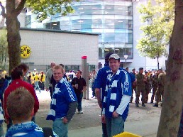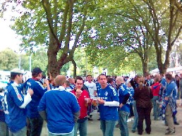 DERBYSIEGER 2005 Wir haben mal wieder keine Kosten und Mühen gespart um uns die Kurany Show im Zeckendorf anzusehen. Hier ein kleiner Überblick des Tages: Pünktlich um zwölf setzten wir uns ab dem New Orleans in Bewegung Richtung Zeckenland !!! Gestärkt von reichlich Bier erreichten wir gegen kurz nach eins den Parkplatz vor dem Stadion, wo wir 04 Euro Gebühr zahlen mußten !!! Danach ging es dann direkt in Richtung Stadion, wo schon tausende Schalker vor den Toren warteten. Die Stimmung vor dem Stadion war komplett in bau-weißer Hand !!! Doch auch hier schmeckte das Bier mal wieder nicht !!! (Zeckenradler war z.B. 0,1 DAB mit 0,3 Fanta gemischt !!!) Also gingen wir rein und suchten unsere Plätze auf den Steh und Sitzrängen. Die Sitzplätze waren so weit vom Spielfeld weg, so das man nur wenig vom Spiel hatte. Lächerlich war auch das Vereinslied der Zecken, denn der Text wurde auf den Anzeigetafeln extra eingeblendet, damit überhaupt jemand mitsang !!!! Beim Spiel zeigten wir Ihnen dann wer die Nr. 1 im Pott, auf dem Platz und auf den Rängen ist und wir gewannen dank Kurany verdient mit 2:1 !!! Beim Rückweg bekamen wir dann die schlechten Verlierer zu spüren, welche uns die Kappen klauten !!! Fazit: - Bier scheiße - schlechte Sicht - scheiß Fans (eher Zuschauer!) aber nächstes Jahr sind wir wieder dabei wenn wir die 3 Punkte abholen ! | |||||||||||||||||||||||||||||||||||||||||||||||||||||||||||||||||